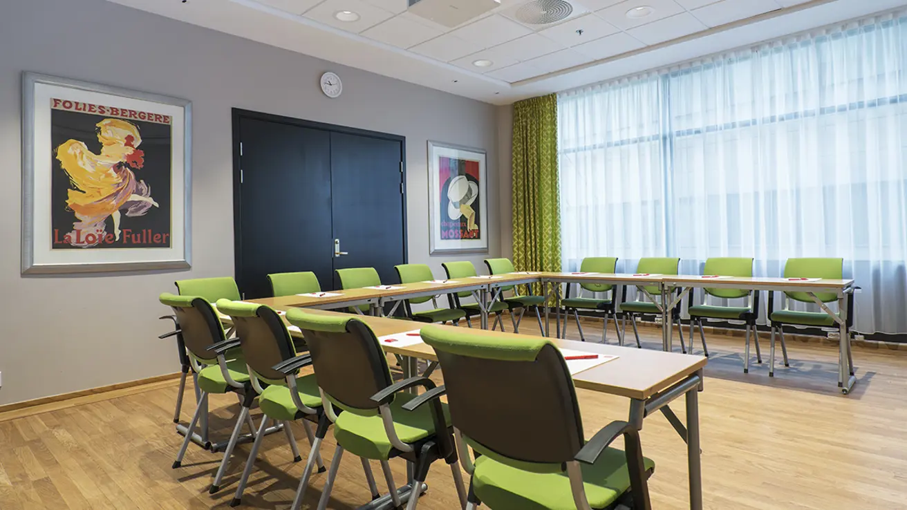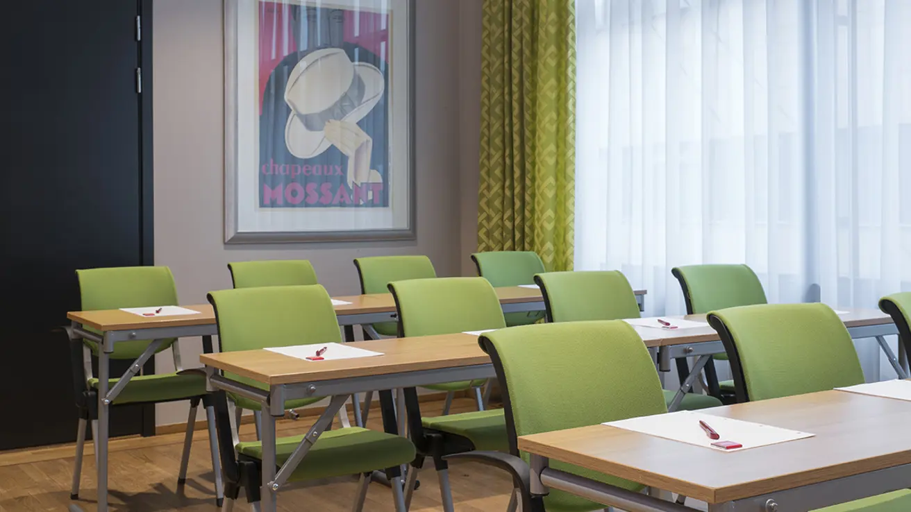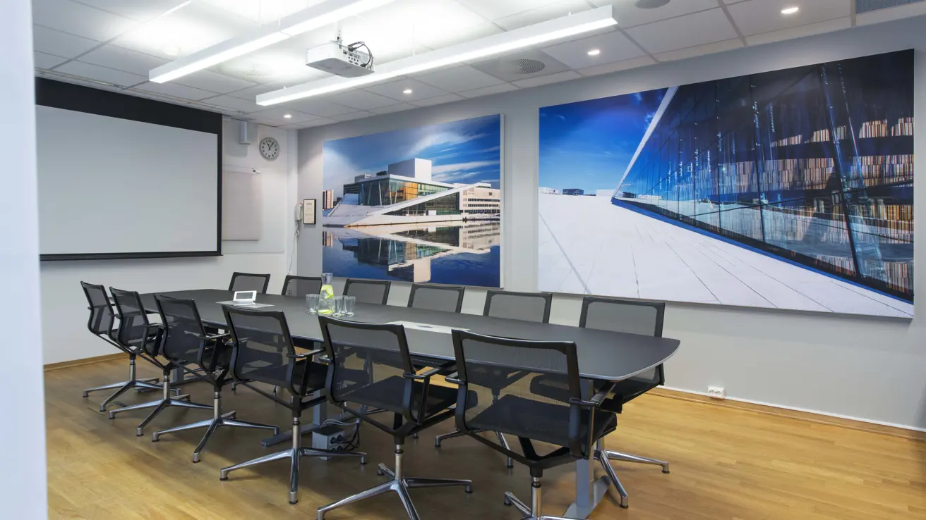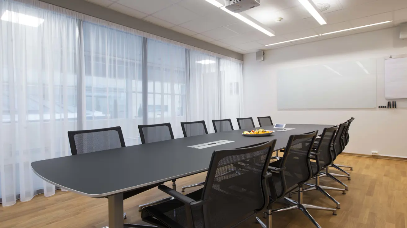 Fidelio has a fixed boardroom layout for 12. This meeting room has no window. The corridor leads to an airy terrace and mingling area.