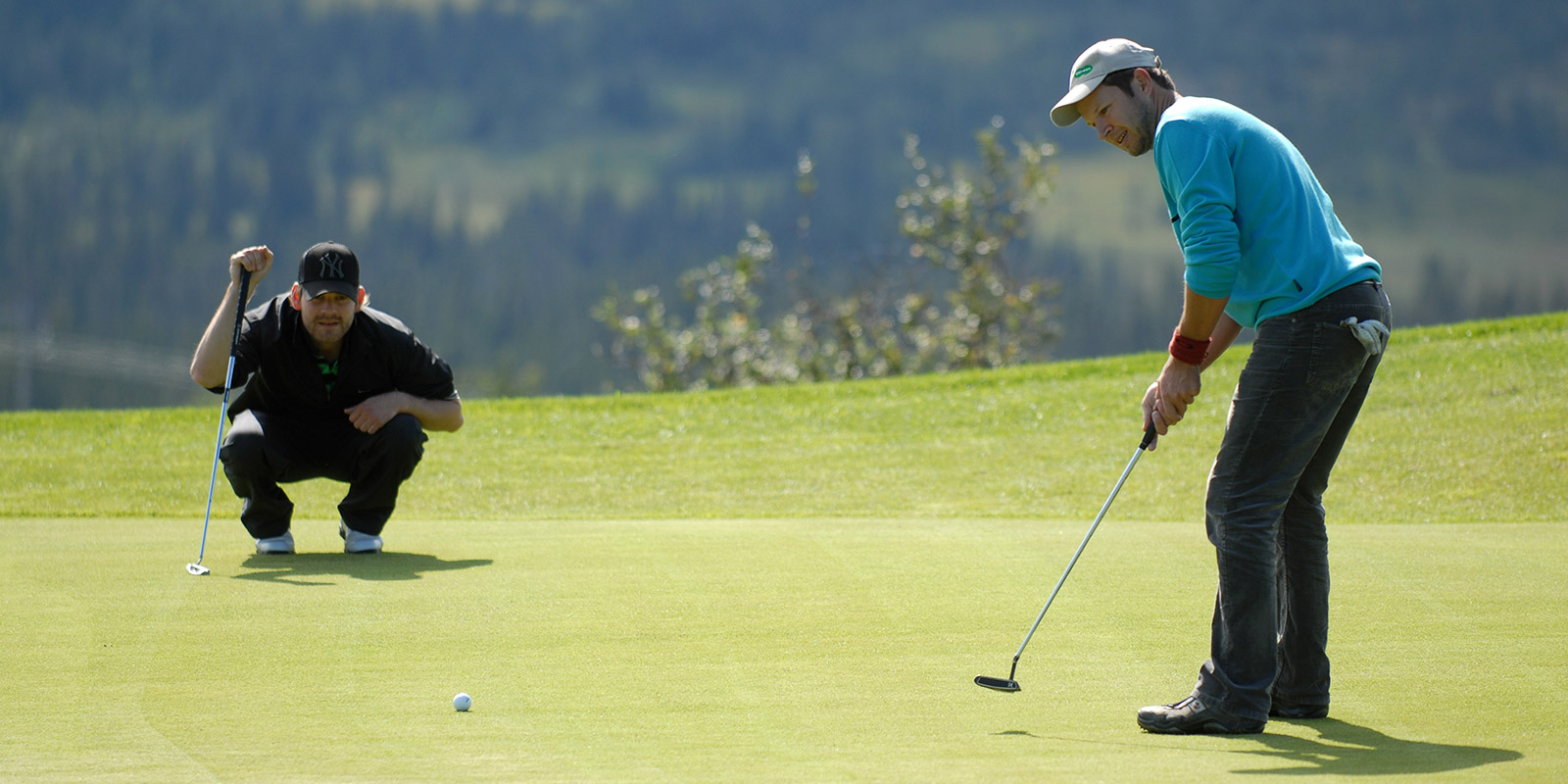 Turkise vegger, fire mørkeblå lenestoler, salongbord, puff, parkettgulv, vindu