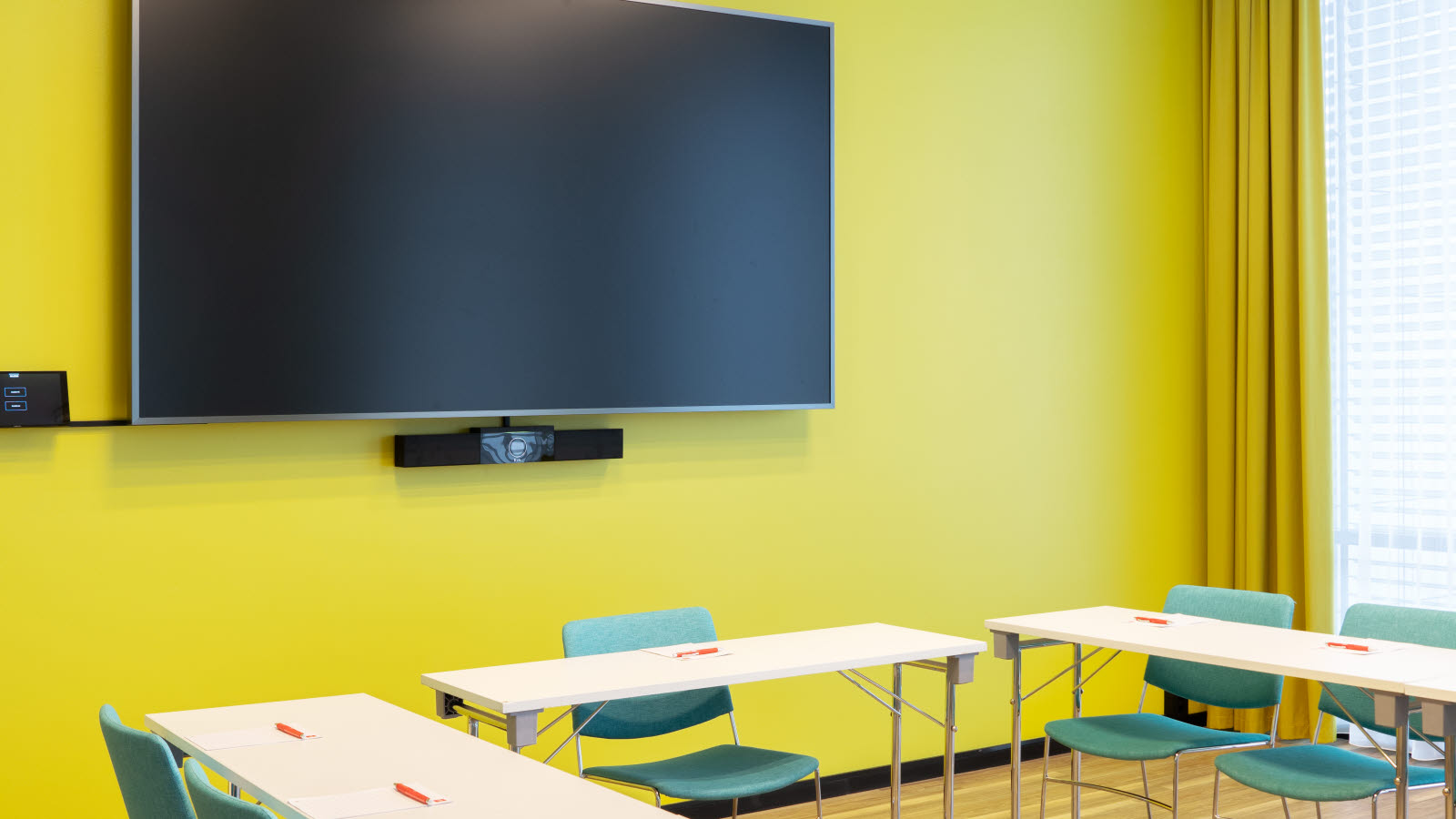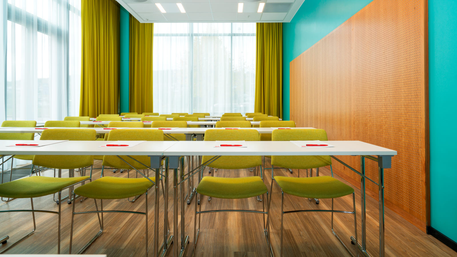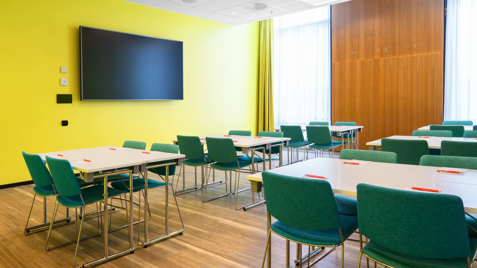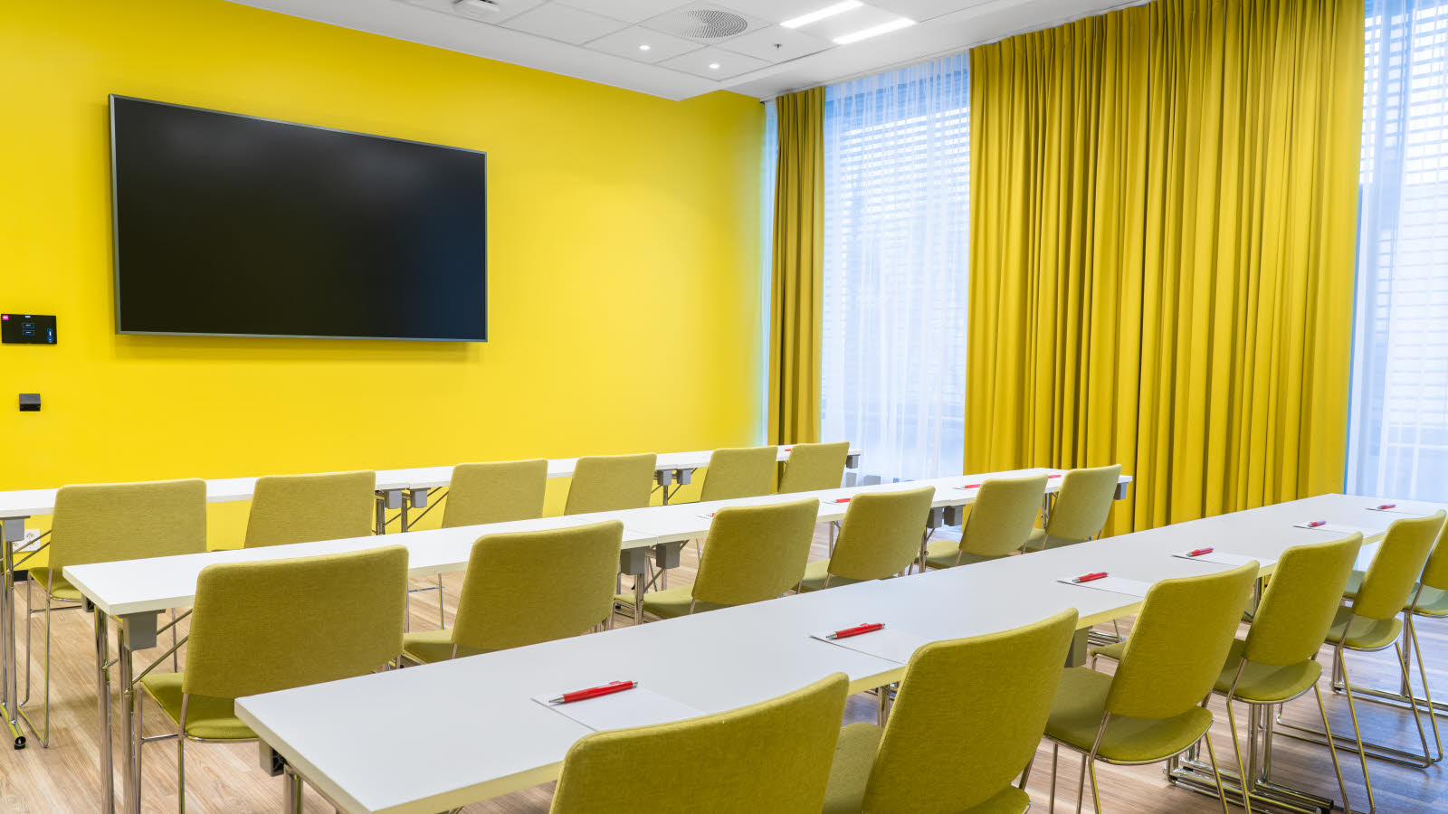 Norgessalen med prosjektor og gule og grønne stoler på Thon Hotel Arena i Lillestrøm