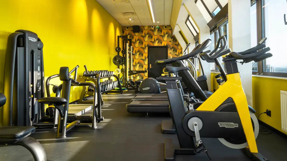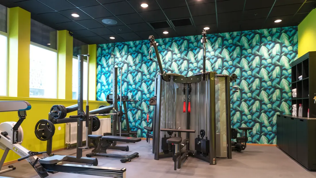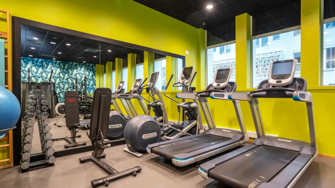 Treningsrom med tredemøller, elipsemaskin, treningsbenk og manualer.