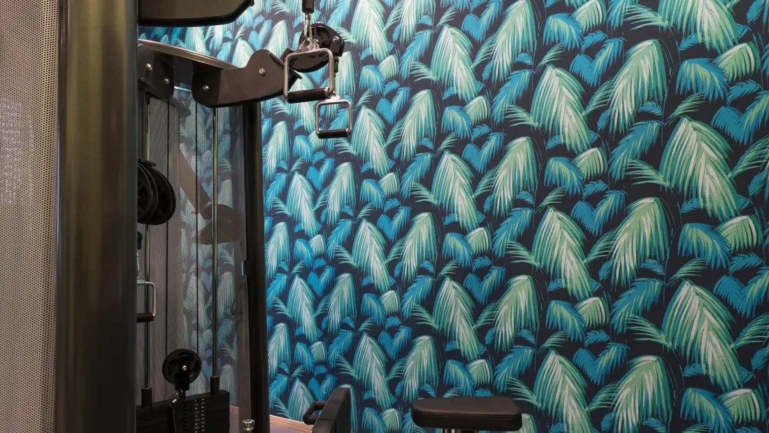 Lobbyområde med blå velour sofa, to gule lenestoler, mønstrete tapet og grønt gulvteppe