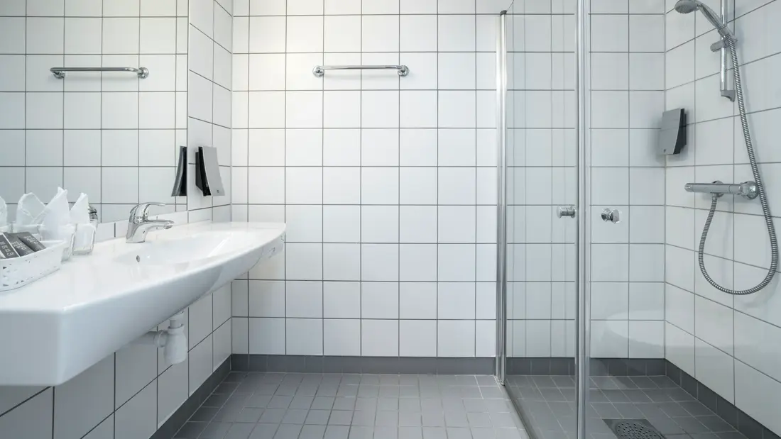 Chambre pouvant accueillir jusqu’à deux personnes. Accès facile à la chambre, espace supplémentaire pour fauteuil roulant et poignées aux toilettes et dans la douche.