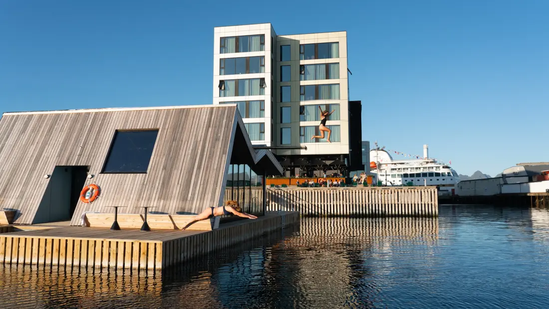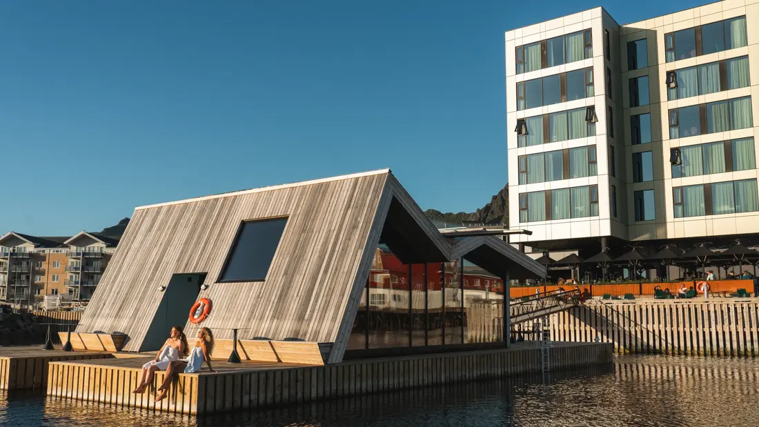 LYST Lofoten Sauna Svolvær is located on the floating jetty in front of Thon Hotel Svolvær, with views of Vestfjorden, the entrance to the port of Svolvær and the mountains behind it. There are two saunas, 'Fløya' and 'Blåtind', as well as women’s and men’s changing rooms, both with hot water showers and toilets. There is also a diving board on the roof.