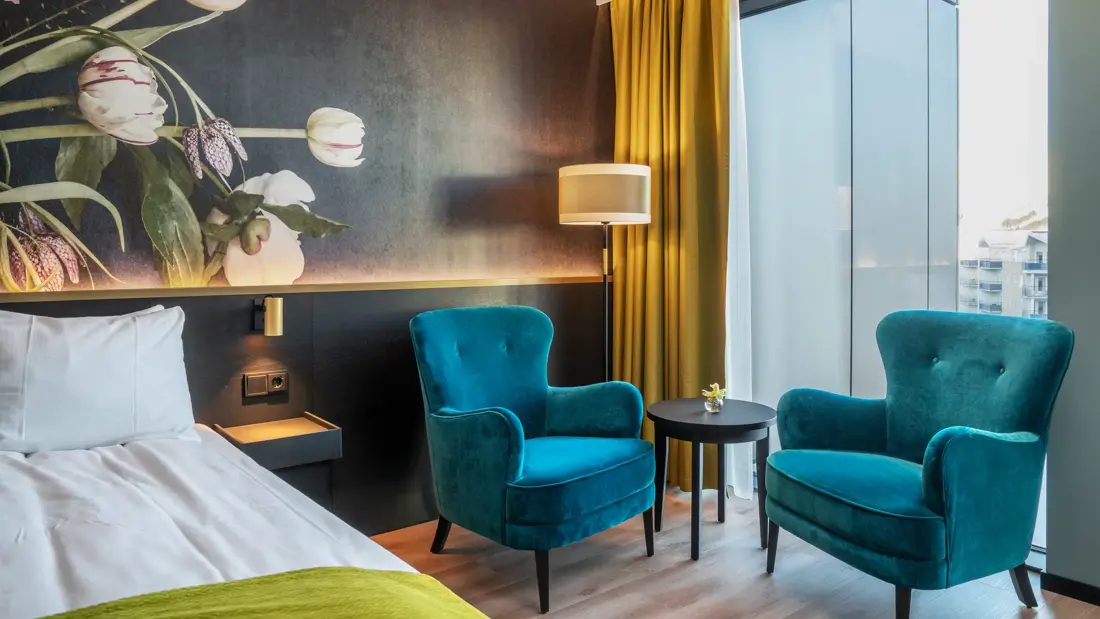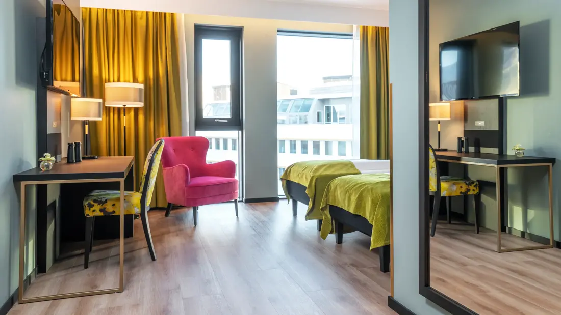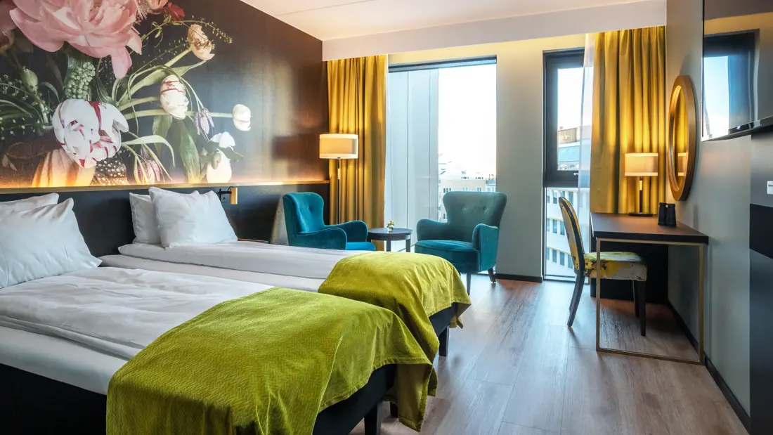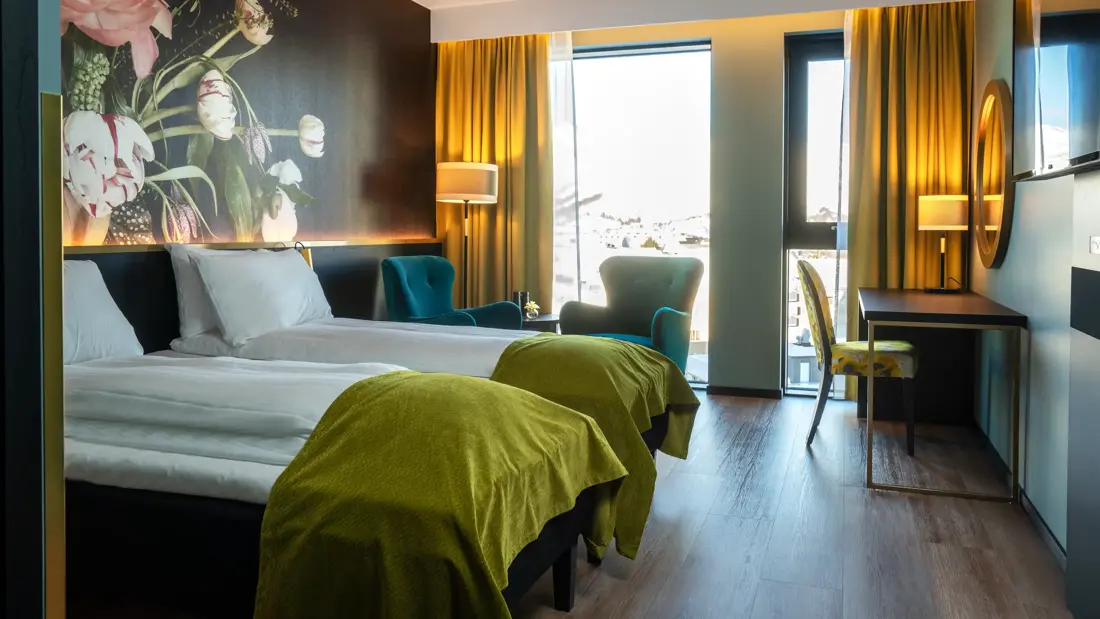 Larger double room with a view, with easy access to the room, extra space for a wheelchair and handrails by the toilet and in the shower. The room has a sofa/seating area, Nespresso machine and two single beds (90 cm) for up to two people.