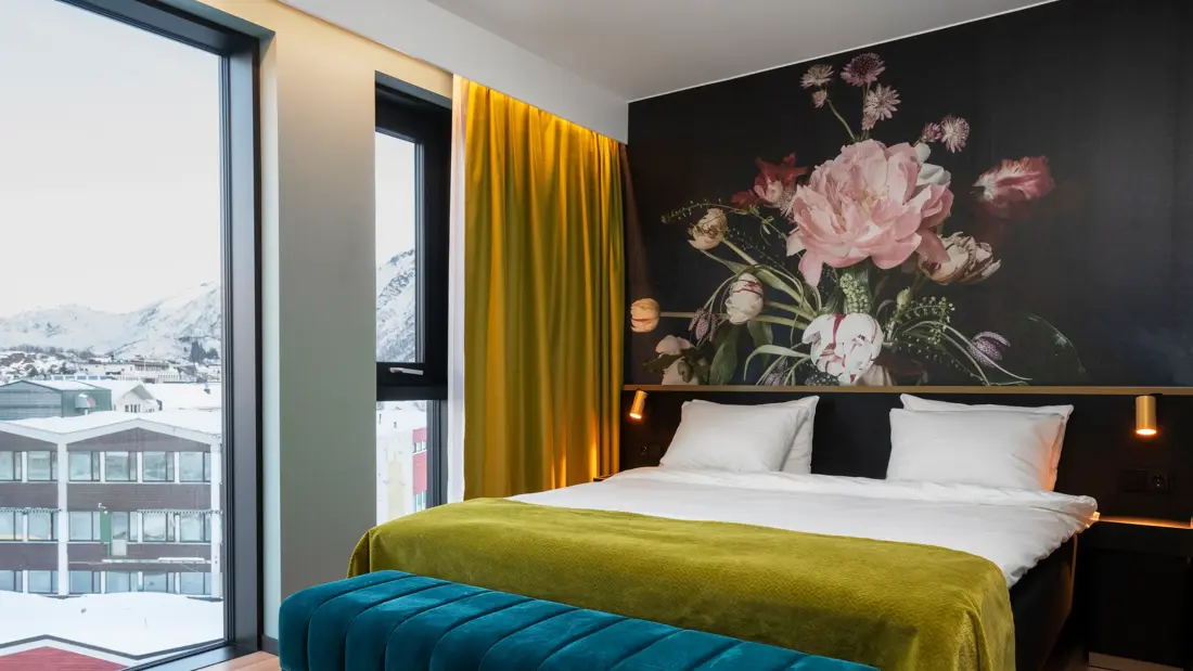 utsikt fra hotellseng på junior suite på thon hotel svolvær