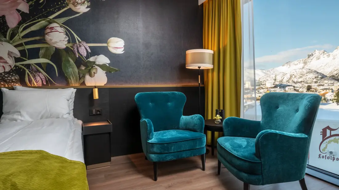 Istårn Suite with a view of the Vestfjord. The suite has two large single beds (120 cm) for up to two people and a comfortable seating area, as well as a dining table.