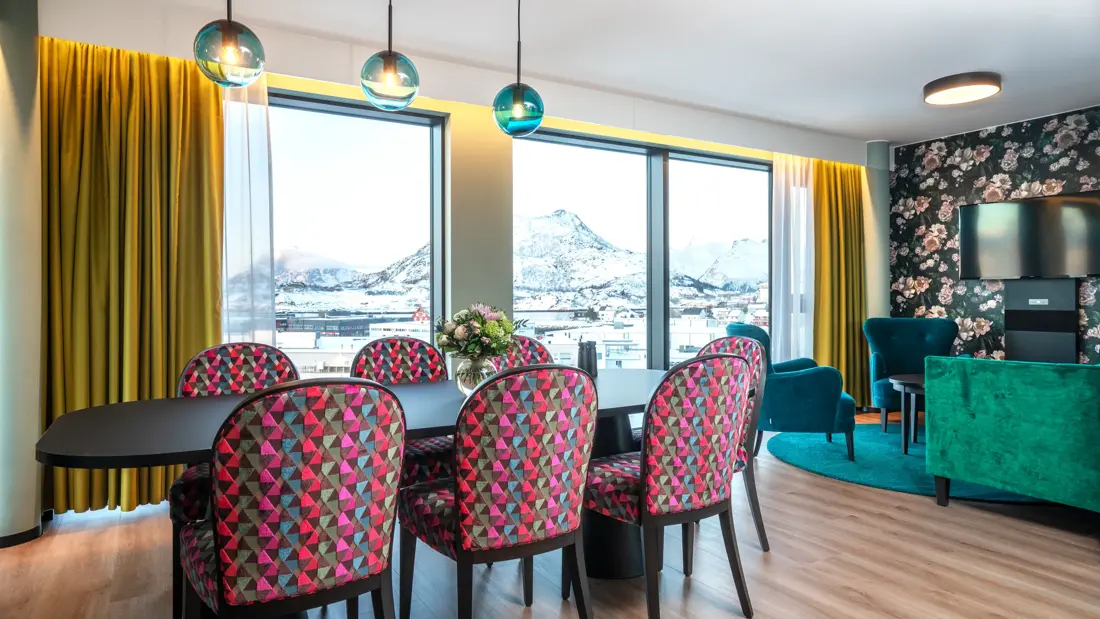 bilde av hotellseng, spisebord og sittegruppe på istårnsuite på thon hotel svolvær