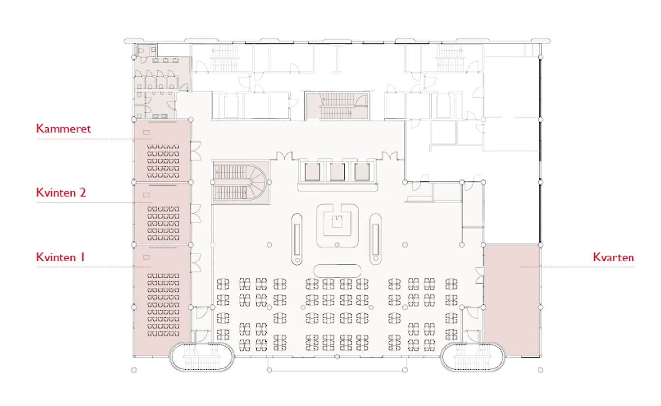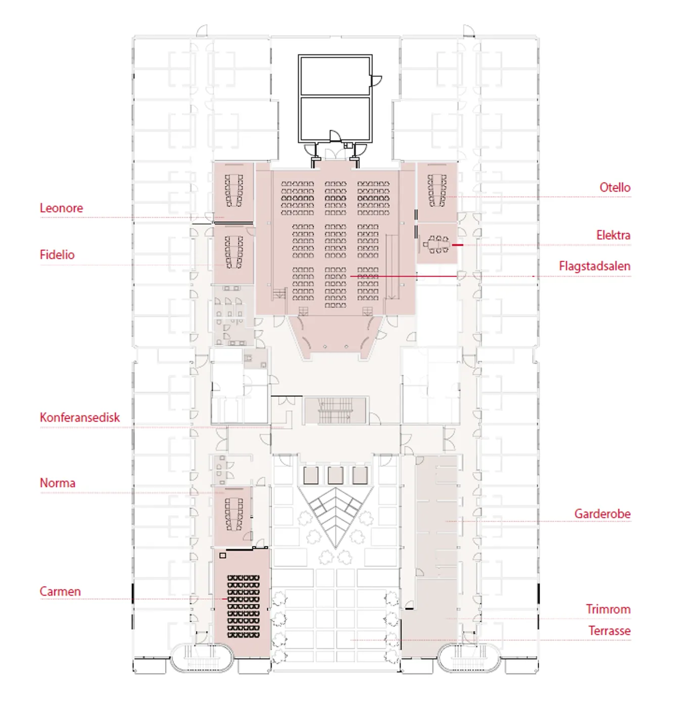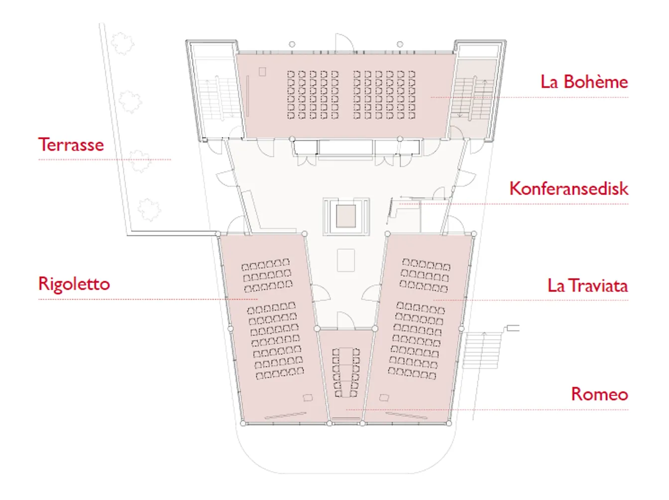 Fidelio heeft een vaste opstelling met een vergadertafel voor 12 personen. De vergaderzaal heeft geen ramen. Via een gang komt u bij een ruimtelijk terras en receptieruimtes