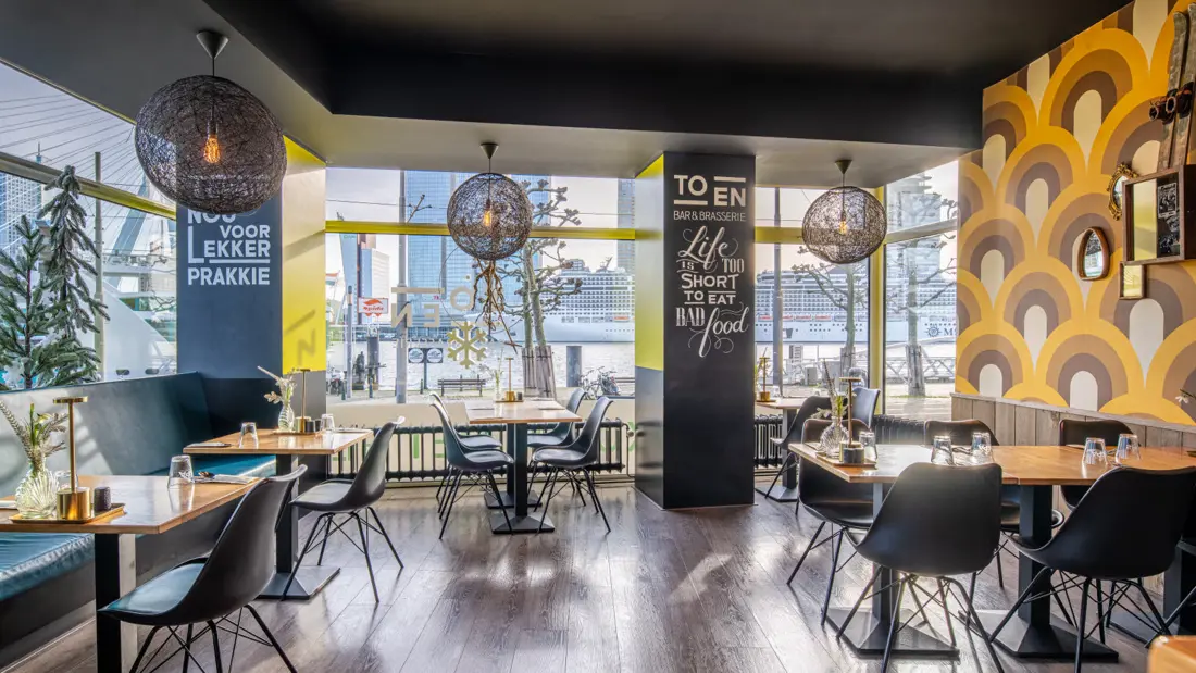 Brasserie ‘Toen Bar & Brasserie’ is een moderne, comfortabele plek met een prachtig uitzicht over de Erasmusbrug en de rivier de Maas. Bij Toen Bar & Brasserie kunt u gaan zitten voor een kopje koffie, een heerlijke lunch of een diner in een vriendelijke en ontspannen sfeer.