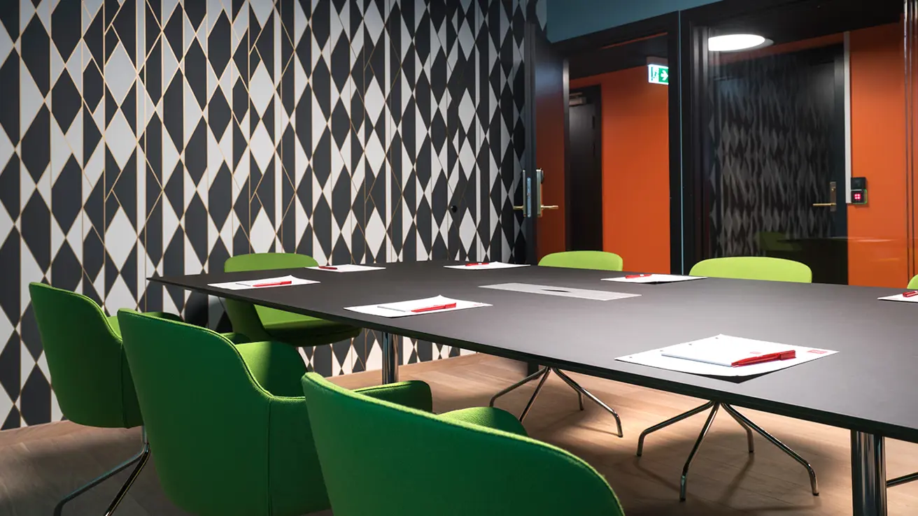 Mørk marmor disk og turkis vegg i resepsjon på Thon Hotel Bristol Bergen