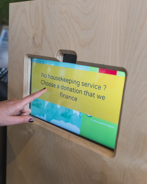 Thon Hotels in Brussels collaborates with the European Cancer Organization, the Belgian Red Cross and Birds Bay. Under this collaboration, guests staying at the hotel for more than one night can choose to hang a green card on the outside door handle stating that they do not want the room to be cleaned. In return, the guest receives a green gift card for EUR 5 that can be used in the bar/restaurant, or donated to GoodPlanet. For the donated money, GoodPlanet runs projects aimed at children and young people to create awareness of sustainability issues such as consumption, waste management, energy and climate, nature, food and water.