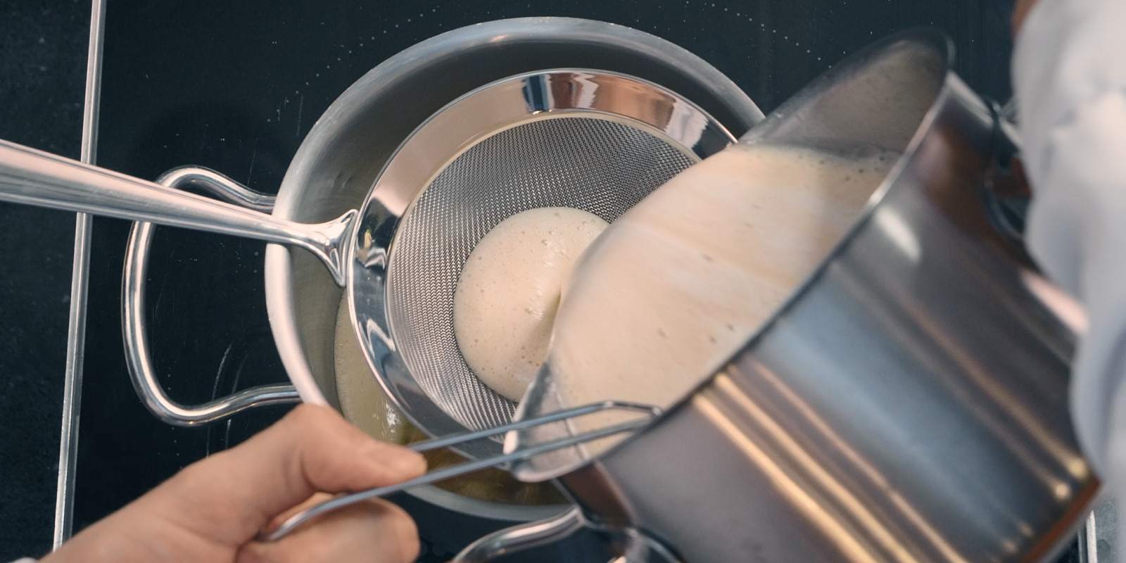 4. Når smøret når minimum 160 grader kan du sile det over i en kald kjele. Smøret kan varmes til maksimalt 180 grader, og vil da få en dypere karamellisering. Varmere enn dette vil det bli brent.
